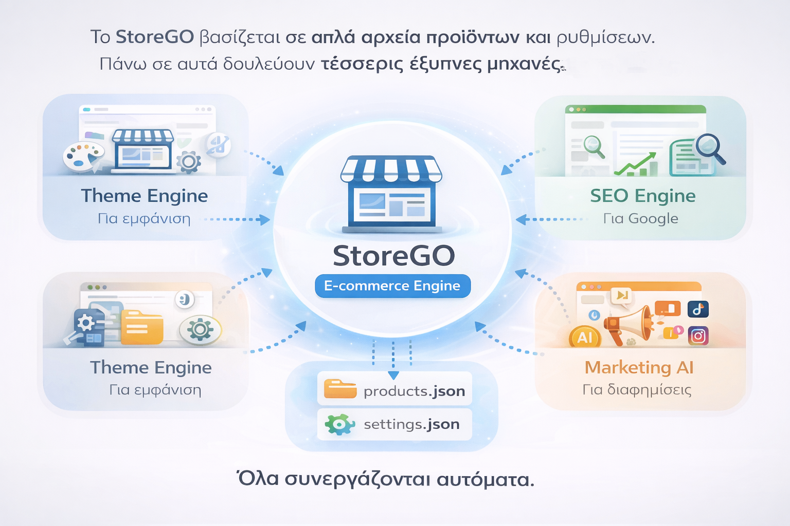 ο StoreGO είναι ένα σύγχρονο e-commerce engine με τεχνητή νοημοσύνη, που σου επιτρέπει να στήσεις ένα πλήρες ηλεκτρονικό κατάστημα χωρίς πολύπλοκες ρυθμίσεις, χωρίς plugins και χωρίς βάσεις δεδομένων.
